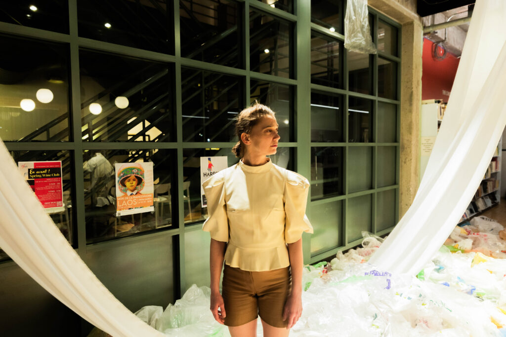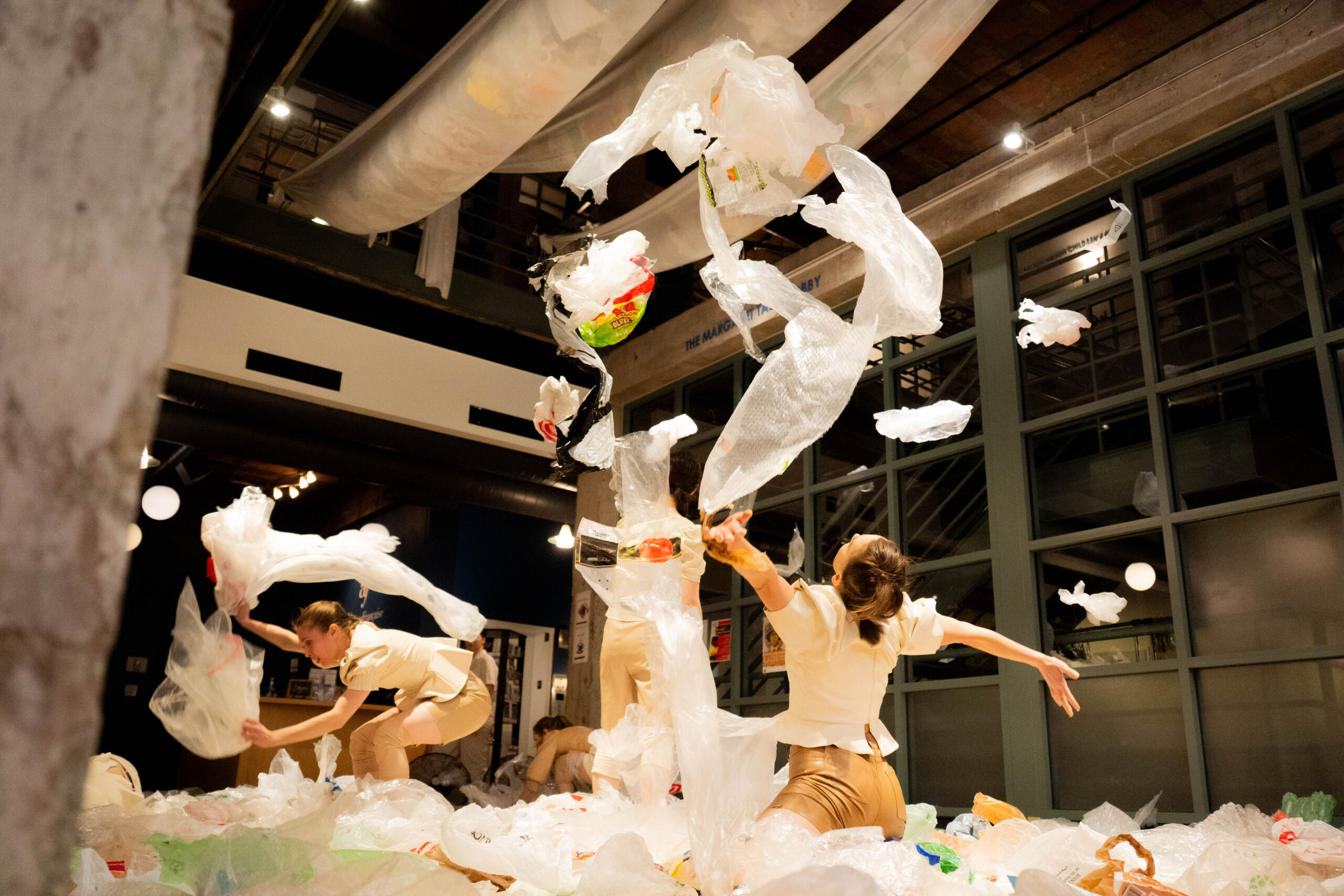 In preparation for a performance she likes to describe as “Nightmare Escape on Plastic Island,” Brenna Mosser tightens the hammocks filled with single-use plastic, which hang over the stage, waiting to be dropped mid-performance.