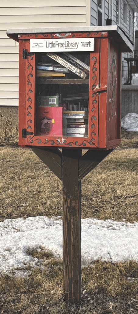 When deciding on colors to paint her Little Library, Jane tapped into her Norwegian heritage and painted it a rusty, bright red and a teal blue. For an added flare, she had her friend, who is an artist, paint designs inspired by a traditional Norwegian folk art style called “Rosemaling.” Four years later, another friend of hers built a bench in the