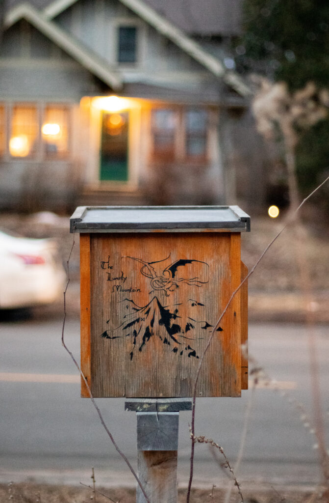 Kelsey Binder’s mysterious Little Free Library in Minneapolis is a safe haven for books in the fantasy genre. It has a medium wood finish with images inspired by “The Lion, the Witch and the Wardrobe” decorated on one side, Hogwarts on the other and an image of the “Lonely Mountain” from “The Lord of the Rings” on the back. Binder purchased and put up her library in spring of 2022 with a previous roommate, and they wanted the simple illustrations to represent core, recognizable fantasy books.