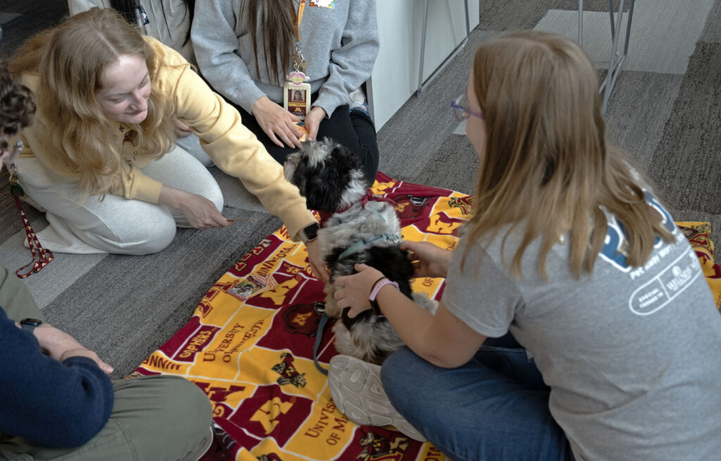The 7-year-old, 13-pound Maltese Shih Tzu mix sits patiently on a matching University of Minnesota blanket on the floor by his owner, Megan Schoenbauer. They wait for students who come by to pet and scratch his curly gray and black fur. At the university’s Pet Away Stress and Anxiety (PAWS) program, roughly five teams of dogs, bunnies, cats, guinea pigs and chickens are stationed around the Health Sciences Education Building’s seventh-floor student lounge. The absence of barking, meowing or clucking creates a calm scene for students to walk around, pet the therapy animals and start conversations with the handlers about their chaotic school schedule, beloved family pets and whatever else comes up.